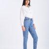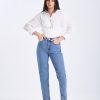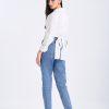 Cotton poplin top made in fine fabric, featuring contrast buttons and a waist-belt. Non-sheer.